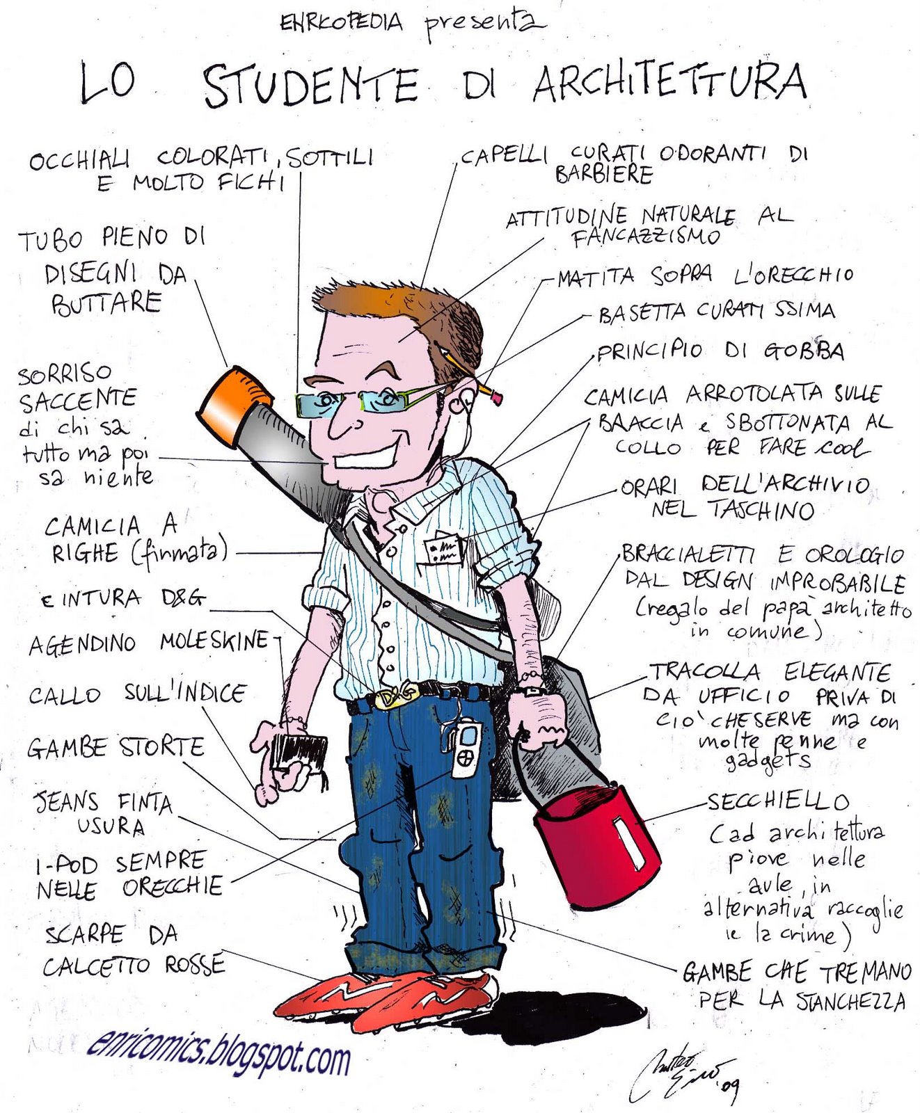 Per par condicio trovo giusto inserire anche il bestiario di noi architetti, che siamo molti e vari e per niente simili tra noi… Eh si, perchè c’è un modo di vedere l’architetto nell’immaginario comune e una realtà molto varia che invece ci caratterizza. Ma adiamo con ordine: quando riusciamo ad accedere alla Facoltà di Architettura, abbiamo tutti in mente un modello di architetto a cui miriamo, per cui fuori dalle università si vede una fauna variegata e molto curiosa di giovani “architettandi” che mirano ad essere strani perchè così deve essere l’architetto. Tendenzialmente però possiamo riassumere la tipologia nella vignetta del bravo Enrico che vado ad aggiungere qui